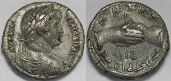 Egypt Hadrian AR Tetradrachm (Alexandria, AD 128-129) Laureate, draped, and cuirassed bust right, seen from behind / ΠATHP ΠATPIΔOC around, clasped hands; L above, IΓ (date) below. 13.34 grams, 25 mm. Good Very Fine. RPC 5728, Dattari 1525. Purchased from Naville Numismatics (GB). |