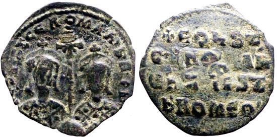 Obv: Crowned facing half-length figures of Constantine and Romanus, holding globus surmounted by patriarchal cross between them.