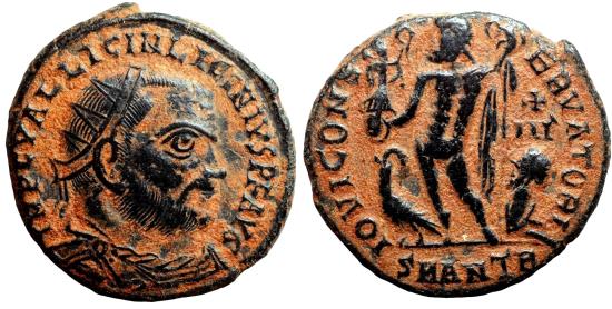 Obverse: IMP C VAL LICIN LICINIVS P F AVG. Radiate, draped and cuirassed bust right. Reverse: IOVI CONSERVATORI. Jupiter standing left, chlamys across left shoulder, holding eagle-tipped sceptre and Victory on globe; in lower left field eagle with wreath in beak standing left, head right, in lower right field a captive seated right; X over IIΓ in right field, SMANTB in exergue. Very nice coin, in EF/EF- condition, conserving full details on both sides, including a precious bust of Licinius I on obvere. Dark green patina. RIC VII 35 B. Antioch mint, AD 321-323. 3,65 g - 18 mm -------------------------------------------------------------------------------------------------- Visit our site about Numismatics and Archaeology: aeternitas-numismatics.com |