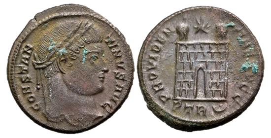 Constantine I, The Great, 306 - 337 AD AE Follis, Treveri Mint, 19mm, 3.18 grams Obverse: CONSTANTINVS AVG, Laureate head of Constantine right. Reverse: PROVIDENTIAE AVGG, Campgate with no doors, two towers and star above, PTR and pellet within crescent in exergue. RIC 475 |