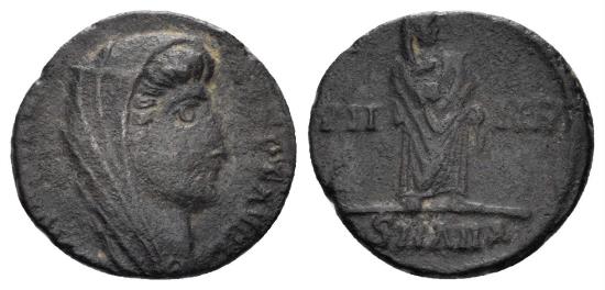 Divus Constantine I. Died 337. AE Follis (1.48g, 14mm). Antioch mint. Struck 347/8 AD. Obv.: DV CONSTANTINVS PT AVGG, veiled head right. Rev.: Constantine, veiled, standing right; VN-MR across field; ANTA in exergue. RIC 117; LRBC 1400. VF.