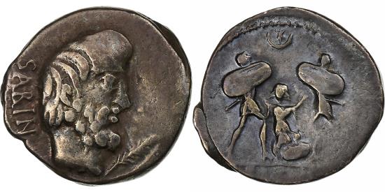 | | Tituria, Denarius, 89 BC, Rome, Silver, , Crawford:344/2b | | | Bearded head of King Tatius, right. Palm-branch., Two soldiers with shields killing Tarpeia, between; above, star in crescent., SABIN, L·TITVRI | | FEATURES |