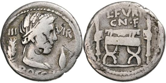 | | Furia, Denarius, 63 BC, Rome, Silver, , Crawford:414/1 | | | Head of Ceres, right; on left, corn-ear., Curule chair; on either side, fasces., Banker's marks. L. Furius Brocchus, III VIR BROCCHI, L·FVRI / CN·F | | FEATURES |