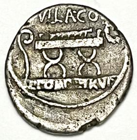 Rev: SVLLA•COS, curule chair set on tablet inscribed Q•POMPEI•RVF, lituus right in left field, wreath downward in right field.