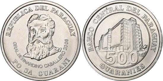 | | Paraguay, 500 Guaranies, 2006, Nickel-Steel, , KM:195a | | | Head of General Bernardino Caballero facing, Bank above value in circle, REPUBLICA DEL PARAGUAY | | FEATURES |