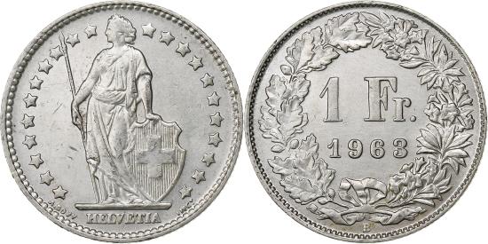 | | Switzerland, Franc, 1963, Bern, Silver, , KM:24 | | | Standing Helvetia with lance and shield within star border, Value, date within wreath | | FEATURES |