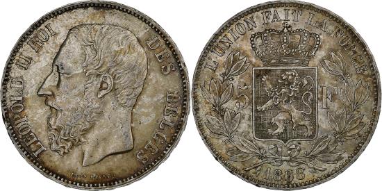 | | Belgium, Leopold II, 5 Francs, 5 Frank, 1868, Silver, , KM:24 | | | Smaller head, engraver's name near rim, below truncation, Crowned arms on ornate shield divide denomination, wreath surrounds, LEOPOLD II ROI DES BELGES | | FEATURES |