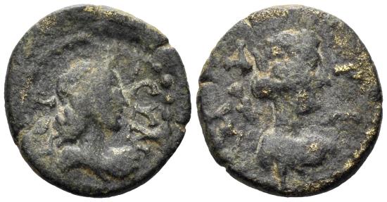 Aiolis, Myrina. Imperial Times. Circa 180 AD. AE 17mm (2.53g). Obv.: IЄPA CYN, draped bust of the Senate right. Rev.: MYPI, draped bust of Dionysos right, wearing ivy wreath and with filleted thyrsus over shoulder. RPC IV online 9703. aVF.