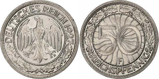 | | GERMANY, WEIMAR REPUBLIC, 50 Reichspfennig, 1927, Stuttgart, Nickel, | | | Eagle within circle, leaf spray below, Denomination within lined circle, oak leaves and acorns above | | FEATURES |