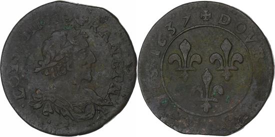 | | France, Louis XIII, Double Tournois, 1637, Axe Loire-Rhône, Copper, | | | Variety with two dots. | | FEATURES |