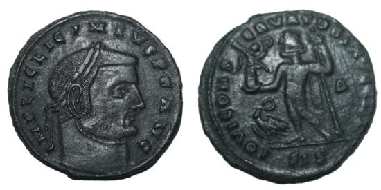 IMP LIC LICINIVS PF AVG Laureate head right IOVI CONSERVATORI AVGG NN Jupiter standing left,holding Victory on globe and scepter; eagle to left. Weight: 3.22 gr Diameter: 22.9 mm