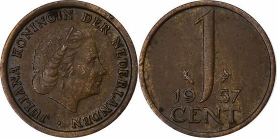 | | Netherlands, Juliana, Cent, 1957, Bronze, , KM:180 | | | Head right, Value divides date | | FEATURES |