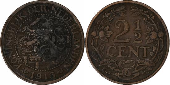 | | Coin, Netherlands, Wilhelmina I, 2-1/2 Cent, 1913, , Bronze, KM:150 | | | Crowned arms with 15 large shields within beaded circle, Value within wreath, KONINGRIJK. | | FEATURES |