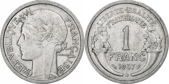 | | France, Franc, Morlon, 1957, Beaumont - Le Roger, Aluminum, | | | Morlon, Laureate head left, Cornucopias flank denomination and date | | FEATURES |