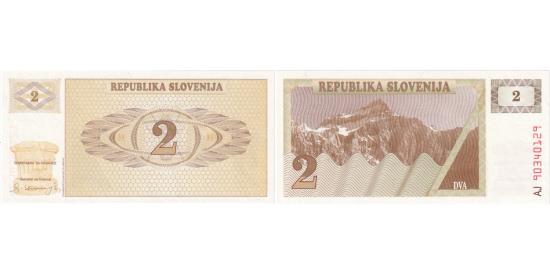 | | Slovenia, 2 (Tolarjev), 1990, KM:2a, UNC(65-70) | | | Issued note., Pedimented beehive at lower left, denomination numeral in guilloche over a representation of the dance of the Catrniolan bee on an underprint of honeycomb at center right., Mountain ridge of Triglav at left center., Brown on tan and ochre underprint. | | FEATURES |
