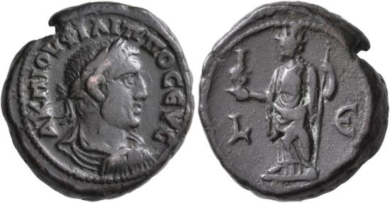 Reverse: Alexandria standing left wearing mural crown holding bust of Serapis and scepter.