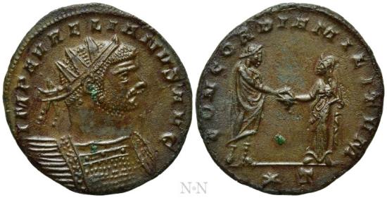 Obv: IMP AVRELIANVS AVG.Radiate and cuirassed bust right.Rev: CONCORDIA MILITVM / (star) T.Emperor and Concordia standing facing each other, clasping hands.