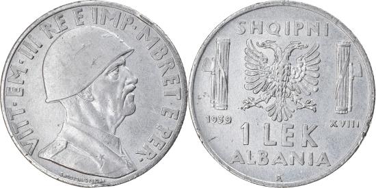 | | Coin, Albania, Vittorio Emanuele III, Lek, 1939, Rome, , Stainless | | | Helmeted head right, Double eagle between columns, value below, Coins dated after 1939 were not struck for circulation. | | FEATURES |