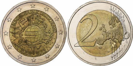 | | Germany, 2 Euro, Introduction de l'euro, 2012, Hamburg, Bi-Metallic, | | | Euro symbol on globe at center, child-like rendering around, Reliev map of Europe, stars, lines and value | | FEATURES |