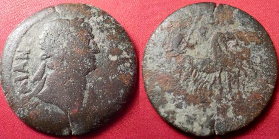 TRAJAN AE 34mm drachm. Alexandria, regnal year 15 (111-112 AD). AYT TPAIAN CЄB ΓЄPM ΔAKIK, laureate head of Trajan to right, with slight drapery on his left shoulder. Reverse - L IE Trajan, holding eagle-tipped scepter and branch, driving quadriga to right. Dattari (Savio) 6920. K&G 27.390. RPC III 4604. 34mm, 16.2g.