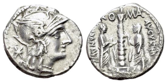 | ROME REPUBLIC Ti. Minucius C.f. Augurinus, Rome, 134 BC. AR Denarius. R/ Ionic column surmounted by statue |