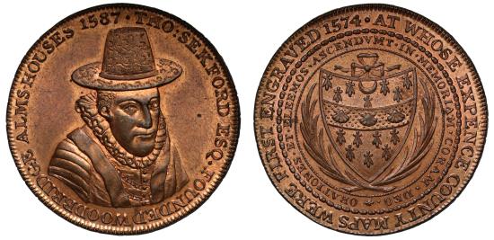 | Woodbridge, Robert Loder (printer & bookseller), copper Penny Token 1796, bust of cartographer Thomas Sekford three-quarters right, legend commences .THO: SEKFORD ESQ . FOUNDED WOODBRIDGE ALMS HOUSES 1587, rev. arms of the Sekford family in palm wreath, outer legend reads AT WHOSE EXPENCE COUNTY MAPS WERE FIRST ENGRAVED 1574, edge PUBLISHED BY R . .LODER 1796. xx ., 34mm, weight 20.36g (DH 15). Small scratch within a die flaw in part of reverse legend, otherwise as struck with full original colour and lustre, an exceptional specimen. |