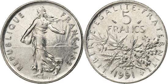 | | France, 5 Francs, Semeuse, 1991, Paris, Nickel Clad Copper-Nickel, | | | Semeuse, The Seed Sower, Branches divide denomination and date | | FEATURES |