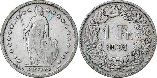 | | Switzerland, Franc, 1901, Bern, Silver, , KM:24 | | | Standing Helvetia with lance and shield within star border, Value, date within wreath | | FEATURES |