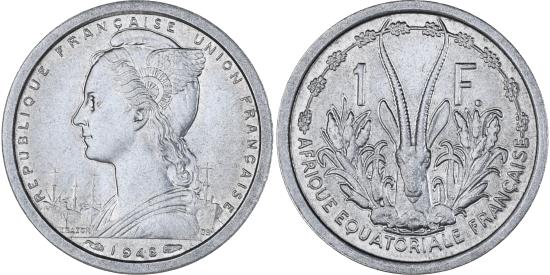 | | Coin, French Equatorial Africa, Franc, 1948, Paris, , Aluminum, KM:6 | | | Winged bust left, date below, Loder's gazelle divides denomination, G.B.L. Bazor | | FEATURES |