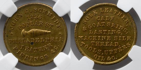 HARD TIMES TOKEN: (1876) Philadelphia PA, John G Schmidt, Penn Cabinets, NGC MS63, ONLY 1 FINER.