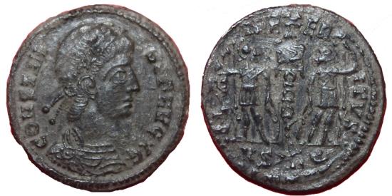 CONSTANS PF AVG Laureate bust right GLORIA EXERCITVS Two soldiers standing on each side of one standard, both holding spear and resting hand on shield. Weight: 1.69 gr Diameter: 16.8 mm