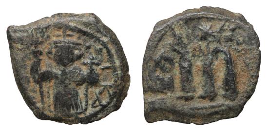 ISLAMIC, Ummayad Caliphate. Arab-Byzantine coinage (Standing Emperor type). Circa 680s. Æ Fals. 4,2 gr. – 20,3 mm. Dimashq (Damascus) mint. Standing imperial figure, holding long cruciform scepter and globus cruciger; to left / Large M. Album 3517.1 var. VF+