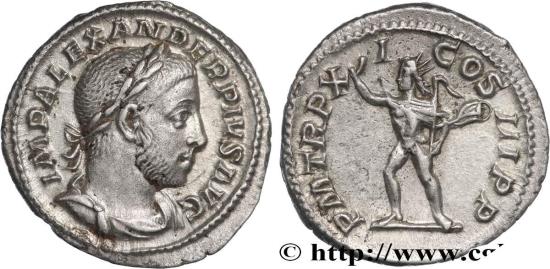 SEVERUS ALEXANDER Augustus Denier 232 Rome silver Obverse : IMP ALEXANDER PIVS AVG Buste lauré et drapé d’Alexandre Sévère à droite, vu de trois quarts en avant (A*01) Reverse : P M TR P X-I - COS III P P Sol (Le Soleil) radié, nu, marchant à gauche, le manteau sur les épaules, levant la main droite et tenant un fouet de la gauche Commentary : Monnaie sur un flan large et bien centré. Superbe revers finement détaillé. Buste agréable. Patine grise avec de légers reflets dorés