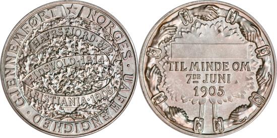 Norway, the 7th June medal in silver, commemorating the dissolution of the union with Sweden 7th June 1905. Mint State condition. Medals with inscriptions were awarded members of parliament and ministers in office at the day of dissolution. Støren & Holst 289; Hallberg II:7. 31 mm; 13,4 g. Protocol no. 5556