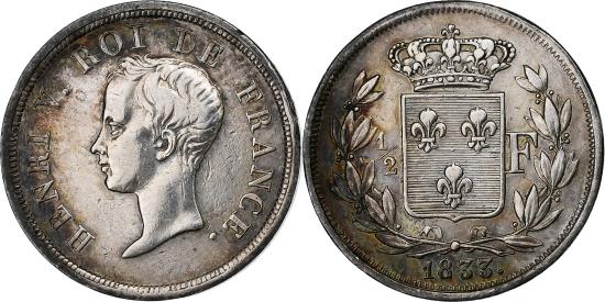 | | France, Henri V, 1/2 Franc, 1833, Silver, , Gadoury:404, KM:23 | | | Prev. KM#PT23. | | FEATURES |