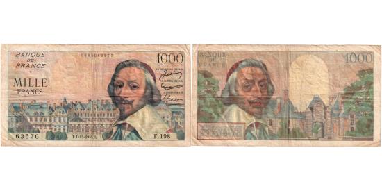 | | France, 1000 Francs, Richelieu, 1955-12-01, F.198, EF(40-45) | | | Signature J. Belin, G. Gouin d'Ambrieres and P. Gargam. 2.4.1953-6.12.1956., Palais Cardinal across, Armand du Plessis, Cardinal Richelieu at right., Town gate (of Richelieu, in Indre et Loire) at right., Multicolor. | | FEATURES |