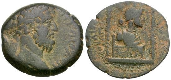 Title: Commodus (AD 177-192). Seleucis and Pieria. Laodicea ad Mare Æ25 / Bust within Shrine