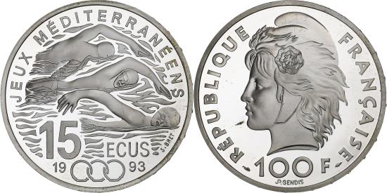 | France, 100 Francs-15 Ecus, Jeux Méditerranéens, 1993, MDP, Proof, Silver |