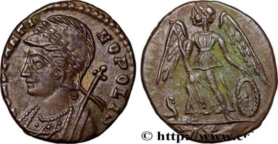 CONSTANTINOPOLIS Centenionalis ou nummus 335-336 Rome R1 copper Obverse : CONSTANTI-NOPOLIS Buste de Constantinople casquée, laurée, drapée et cuirassée à gauche, vu de trois quarts en avant, avec le sceptre sur lépaule (D*2) Reverse : Anépigraphe// R*E Victoria (la Victoire) debout de face tournée à gauche sur une proue de navire, les ailes déployées, tenant un sceptre transversal de la main droite et appuyée sur un bouclier de la main gauche Commentary : Flan court, centré des deux côtés. Superbe buste, finement détaillé. Joli revers. Patine marron