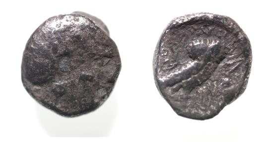 Arabia Felix. Saba’. Mid-fourth-second century BC. AR half unit (11mm, 2.48g). Head of Athena r., wearing Attic helmet; on cheek, Sabaean letter