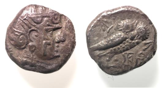 / Owl standing r., head facing; to l., olive spray and crescent; to r., South Arabian monogram. Munro-Hay 1.4ii1; Huth 244.