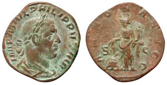 IMP M IVL PHILIPPVS AVG, laureate, draped, and cuirassed bust right / ANNONA AVGG, S C across field, Annona standing facing, head left, holding grain ears with her right hand over modius to left, cradling cornucopia with her left arm.