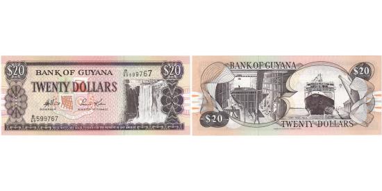 | | Guyana, 20 Dollars, UNC(65-70) | | | Signature 13. Signature title as Acting Governor., Map of Guyana at right, bank arms at center. Ascending size serial number at upper right., Shipbuilding at left, ferry Malali at right. Design element in colored border at ends., Brown and purple on multicolor underprint. | | FEATURES |