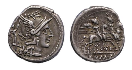 C. Terentius Lucanus. 147 BC. AR Denarius (20 mm, 3.77 grams). Rome mint. Helmeted head of Roma right; behind, Victory standing right, holding wreath, above X (mark of value) / The Dioscuri, each holding spear, on horseback right. Crawford 217/1; Sydenham 425; Terentia 10; RBW 932. Condition: Good VF, Deep cabinet tone, extra fine metal and definition. |