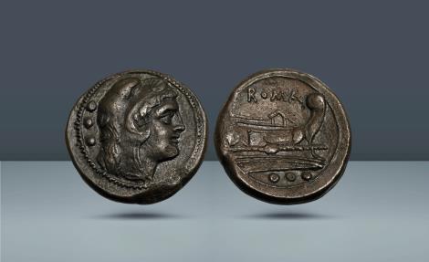 Roman Republic, Italy. Anonymous. Rome, after c. 211 BC, AE Quadrans, 9.30g (21mm, 11h). Head of Hercules facing r. wearing lion's skin with three pellets behind. / Prow r. with ROMA above and three pellets below. Pedigree: Tkalec, 29 February 2008, lot 357 References: Sydenham 143d, RBW 209, Crawford 56/5 Grade: Lovely dark consistent patina. Well struck and preserved. EF Price: $3,400 rr1319