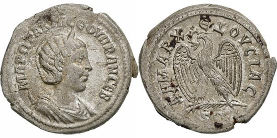| | Seleucis and Pieria, Otacilia Severa, Tetradrachm, 244, Antioch, Silver | | | Bust of Otacilia Severa, diademed and draped, right, crescent at shoulders, Eagle standing left, on palm, spreading wings, holding wreath in beak, RPC VIII, — (unassigned; ID 29034); Prieur 323–4; McAlee 1086., MΑΡ ΩΤΑΚΙΛ ϹΕΟΥΗΡΑΝ ϹΕΒ, ΔΗΜΑΡΧ ΕΞΟΥϹΙΑϹ // S C | | FEATURES |