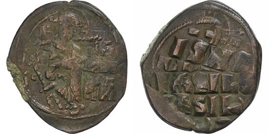 | | Time of Constantine IX, Follis, 1042-1055, Constantinople, Bronze, | | | Christ enthroned facing, wearing a nimbus, holding the Book of the Gospels., Caption in 3 lines., Anonymous follis attributed to the reign of Constantine IX. Restrike on an anonymous follis struck by one of his predecessors. | | FEATURES |