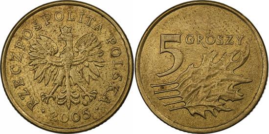 | | Poland, 5 Groszy, 2005, Warsaw, Brass, , KM:278 | | | National arms, Value at upper left of oak leaves, RZECZPOSPOLITA POLSKA | | FEATURES |