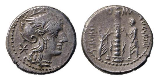 Ti. Minucius C.f. Augurinus. 134 BC. AR Denarius (19 mm. 3.92 grams). Rome mint. Helmeted head of Roma right; mark of value behind / Ionic column surmounted by statue; at base, a stalk of grain on either side; on left, Minucius Augurinus standing right, foot on modius; on right, M. Minucius Faesus standing left, holding lituus. Reff. Crawford 243/1; Sydenham 494; Minucia 9. Condition: Good VF, finely toned, areas of flatness |