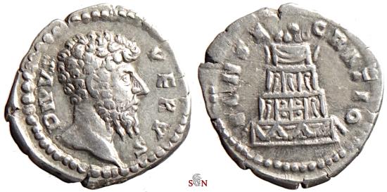 Divus Lucius Verus Denarius, struck under Marc Aurel AD 169 at Rome mint. Obv: DIVVS VERVS, bare head right. Rev: CONSECRATIO, Funeral